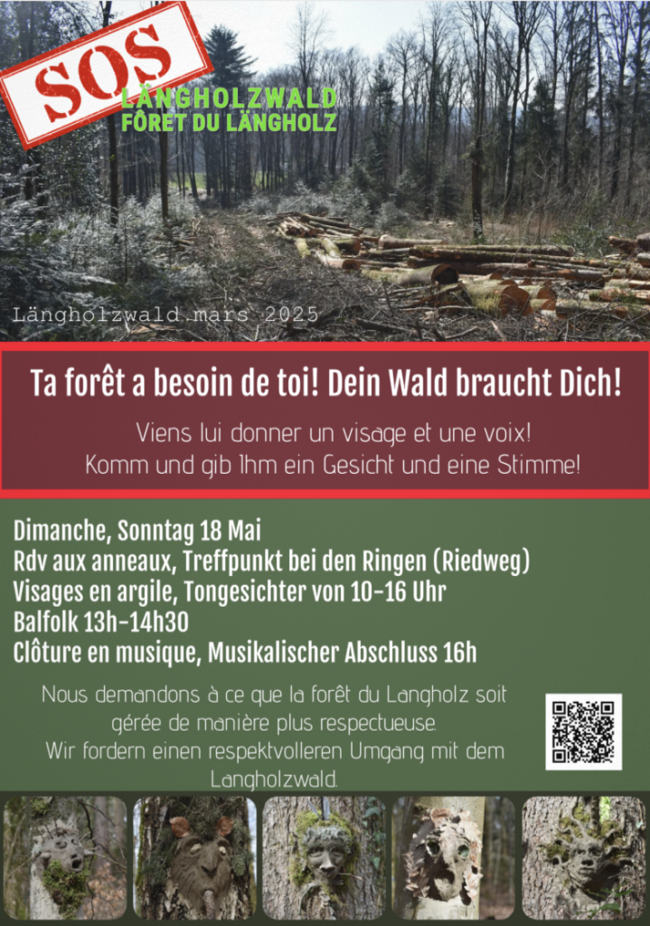 Le 18 Mai, une manifestation intitulée « SOS forêt du Längholz » accompagne le lancement de la 3e pétition. Des visages en argiles orneront à nouveau les arbres du Längholz.