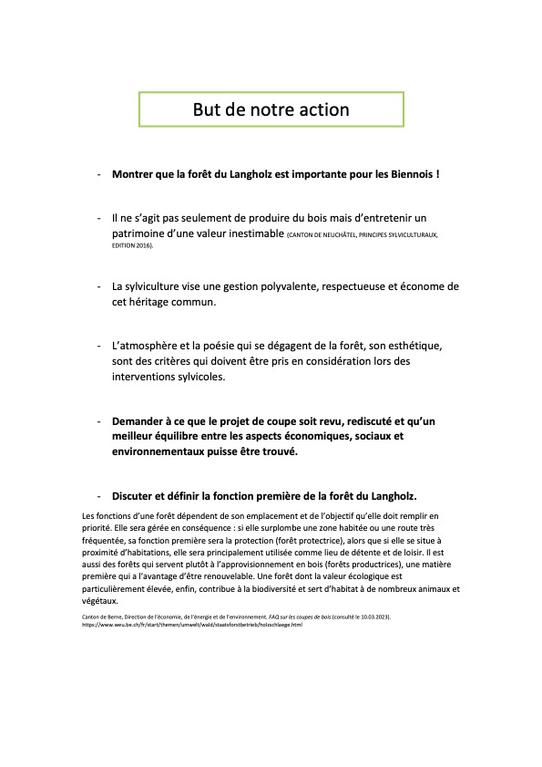Lettre ouverte de Maria Joos et 63 cosignataires, à Erich Fehr, Maire de la Ville de Bienne et Lena Frank, Directrice des travaux publics, de l’énergie et de l’environnement. Les requérants les exhortent à s’engager clairement en faveur de la forêt du Längholz comme forêt de détente.